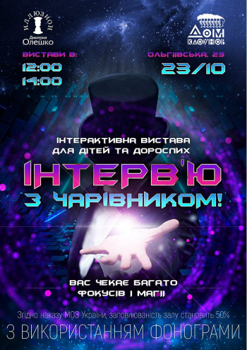 Хотели бы вы взять интервью у настоящего волшебника?Узнать как он живет?О чем мечтает?Почему грустит?Интерактивный спектакль «Интервью с Волшебником» погрузит вас в мир Магии и Иллюзии, а также расскажет вам о жизни последнего Волшебника.Захватывающие фокусы и интерактивные трюки ждут вас.