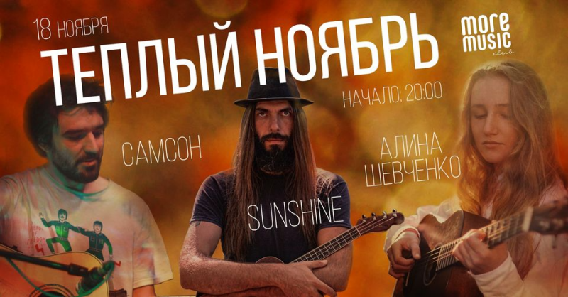Сделаем этот серый ноябрь немного теплее вместе! Атмосферная акустика от одесских музыкантов в More Music Club 18 ноября. Лидер легендарной одесской инди-рок группы Продается Солнце! Александр Самсон, который в последние годы нечасто радует поклонников концертами. Самобытная одесская исполнительница Алина Шевченко представит свои душевные и проникновенные песни в стиле инди-рок. Sunshine сыграет на укулеле и споёт о многогранности жизни и всех её красках.