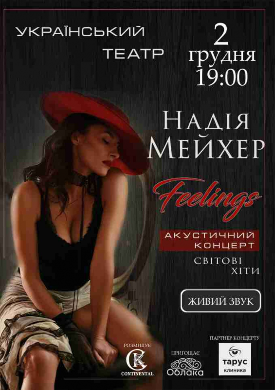 Надежда Мейхер представит в Одессе свою новую программу Акустический концерт «Feelings». Программа состоит из любимых композиций исполнительницы. Это легендарные музыкальные произведения мировой музыкальной сокровищницы. Артистка приглашает всех поклонников, прочувствовать в этот вечер всю душевность и любовь с откровением, авторских стихов с русскими романсами, а также мировыми музыкальными шедеврами, которые Надежда исполнит на испанском, итальянском, французском и английском языках.