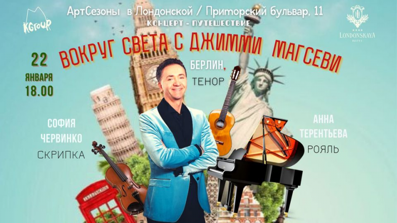 Концерт-путешествие «Вокруг Света» вместе с Джимми Магсеви (тенор, Берлин) - автором множества сольных программ, солистом престижных оперных и театральных сцен мира, среди которых Берлинская Штатс-опера, опера Сан-Франциско, Национальный театр Словении в Мариборе, Государственный театр Швейцарии Санкт-Галлен, фестивали Италии, Японии, Греции, Испании, Австрии и др. - это не просто зимний вечер вокальной музыки у рояля с гитарой и скрипкой. В багаже у Джимми Магсеви, помимо оперных партий и классической музыки - ска, панк, мюзиклы, джаз, церковная музыка, а за плечами - главные роли в мюзиклах “Призрак оперы”, “Рокки”, “Иисус Христос - Суперзвезда” и др. Джимми зачастую можно встретить на клубных сценах Берлина вместе с его группой и оригинальной ска-интерпретацией этно-песен. 22 января в 18.00 в пространстве особняка раннего итальянского ренессанса XIX века, в самом сердце Одессы на Приморском Бульваре 11, в котором расположилась гостиница «Лондонская» нас ждет настоящая музыкальная одиссея - беспредельное звучание классиков, романтиков, современных композиторов и этно-музыки мира.