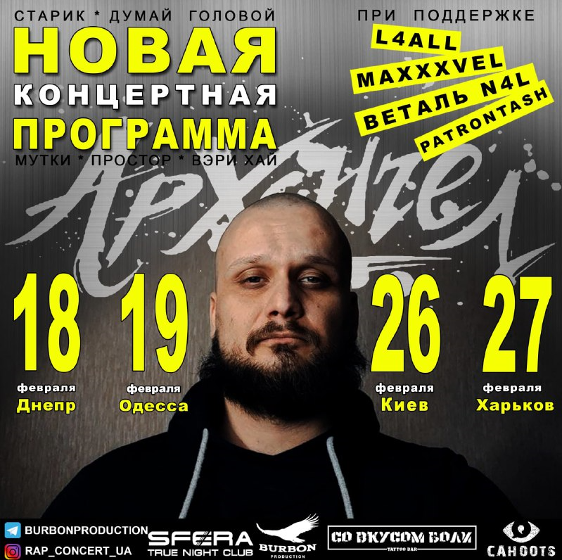 Новая программа Архангела в которую вошли новые треки и любимые хиты, битбокс шоу от Паши BUTTERFLY, общение и немного черного юмора от МС Максим База, подрывные треки Патронташ, тру стиль от L4ALL и ВетальN4L, и атмосфера и глубина от MAXXXV