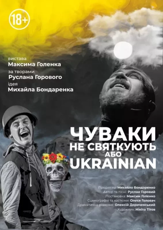 “Чуваки не святкують, або Ukrainian”- театрально-музична, динамічна та правдива вистава про війну з Росією і про те, як ми жили ДО. Сюжет вистави – це вервиця житейських історій українця зі славного міста Конотоп, який щиро ділиться своїми історіями про зростання, любов, дружбу і зраду коханої.