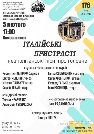 Італійські пристрасті. Неаполітанські пісні про головне... Лауреати міжнародних конкурсів К.Величко (баритон), В.Мельник (тенор), М.Танькут (тенор), С.Чебан (тенор), Г.Слободянік (сопрано), Є.Філіпенко (читець), Е.Талько (скрипка), І.Косинець (гітара).