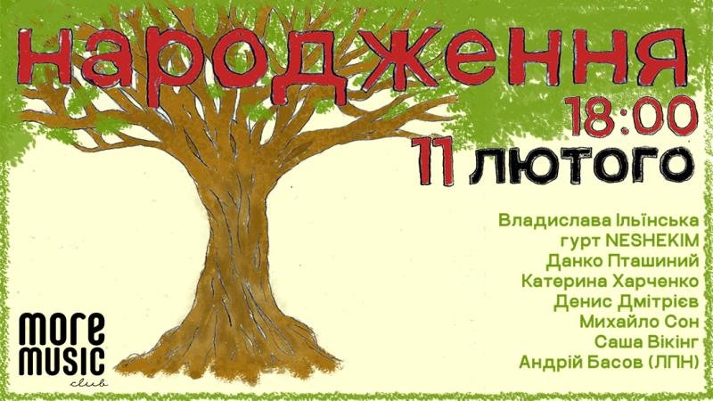 Цей вечір та сцену з ними розділять гурт NESHEKIM, Катерина Харченко Денис Дмітрієв, Михайло Сон, Саша Вікінг та Андрій Басов (ЛПН). Чекаємо вас на поетично-музичну виставу «Народження»