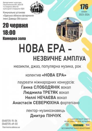 Нова Ера - незвичне амплуа. Мюзикли, джаз, популярна музика, рок. Колектив «Нова Ера», лауреати міжнародних конкурсів Ганна Слободянік (вокал), Людмила Третяк (вокал), Неллі Нечаєва (вокал), Анастасія Северюхіна (фортепіано).