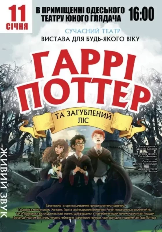 Поспішайте на захопливу виставу «Гаррі Поттер та загублений ліс»! Зустрітися із улюбленим чарівником дітей та дорослих, зазирнути у чарівний світ Гоґвортсу – чи не про це ви мріяли? Упевнені, неймовірні пригоди знаменитих героїв підкорять кожного глядача.