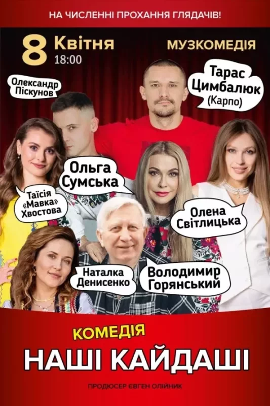 Спіймайте можливість побачити її та Кайдашей у сучасній і неймовірній виставі, яка така близька кожному українцю. Адже вона про нас. Про усіх нас. З усмішкою, нашим гумором і Великим Коханням! Бо усе є Любов! Зірковий склад історії, яку ми усі любимо і, напевно, знаємо, або чули про неї.