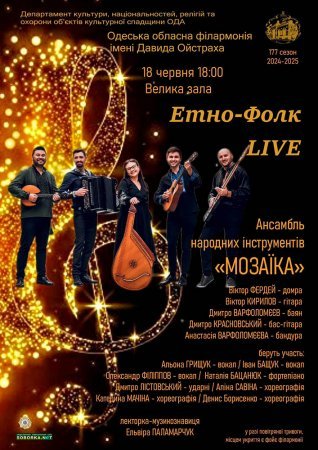 На сцені - ансамбль народних інструментів «Мозаіка» у складі: Віктор Фердей (домра), Віктор Кирилов (гітара), Дмитро Варфоломєєв (баян), Дмитро Красновський (бас-гітара), Анастасія Варфоломєєва (бандура).