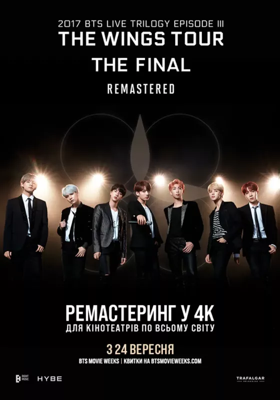 BTS 2017 Live Trilogy EPISODE III THE WINGS TOUR THE FINAL Remastered - BTS закріпили свій міжнародний статус першим здобуттям Billboard Music Award, і їхній блискавичний злет потужно відображений у BTS 2017 Live Trilogy EPISODE III THE WINGS TOUR THE FINAL Remastered. Індивідуальні і спільні виступи демонструють цілий спектр принад через оксамитові голоси і поетичний реп, у той час як енергійні постановки “Blood Sweat & Tears,” “DNA” і “MIC Drop” підкреслюють масштабність туру! Ви побачите поворотний момент шляху BTS на великому екрані.