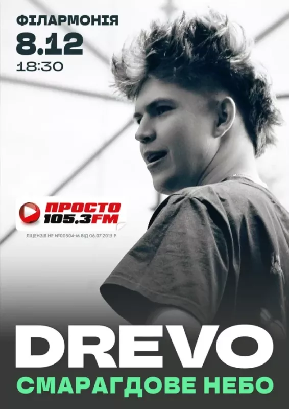 Цей вечір стане унікальною нагодою наживо почути легендарне «Смарагдове небо» та інші улюблені пісні Drevo у супроводі живого бенду. Атмосфера драйву, щирості та емоцій подарує справжнє свято кожному слухачеві. У програмі концерту – проривний трек «Самолітом», прониклива й лірична «Ластівка», енергійний хіт «Де би де би» та інші потужні роботи у виконанні молодої зірки української сцени. Приходьте, щоб відчути магію музики Drevo наживо!