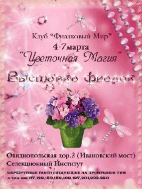Одесская выставка фиалок «Цветочная Магия», посвященная женскому празднику. Для наших милых женщин будут представлены коллекции Одесских коллекционеров, а также гостей нашего города