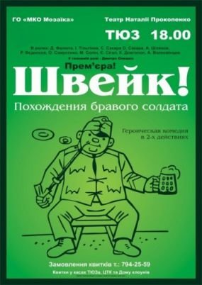 Мало того, что ещё до начала спектакля врач-психиатр внимательно ходит по залу, подыскивая себе пациентов. Так тут же компетентные органы прямо в зале арестовали человек шесть и увели туда, за сцену.Ничего себе начало! Соответствующий душевный настрой создан, и ты уже доволен тем, что тихо сидишь тут, в своём кресле, а не там, за решёткой - в психушке, полицейском участке или в тюрьме.Неожиданное смешение жанров (гротеска, сатиры и драмы) на фоне начала первой мировой войны создают пространство, попадая в которое понимаешь, почему герои Гашека выживают, выкручиваются, спасают, спасаются, при этом пытаясь сохранить честь, достоинство, уважение или напротив, приняв обстоятельства, стать сумасшедшим, больным или идиотом.«Войны не будет, если на нее никто не пойдет. Так можно, ведь это только моя жизнь, только моя» - так считает режиссер спектакля Наталья Прокопенко. Этими словами главный герой спектакля Швейк (Дмитрий Олешко) завершает свое путешествие и возвращается в Прагу, где в трактире «У чаши» вкусно выпьет кружечку пива!В спектакле заняты популярные актеры театров города: