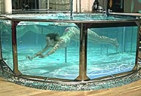Водное стриптиз-шоу организовывается в центре первого этажа, где расположен 10-тонный аквариум с водой.