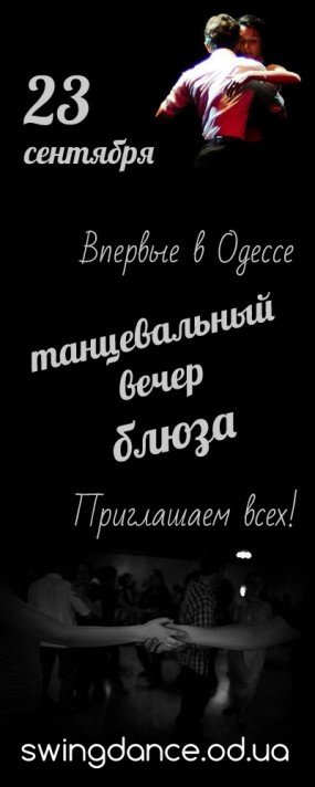 Блюз — танец для гурманов. Вы его уже танцевали, просто не знали об этом. Его романтичность не уступает даже аргентинскому танго. Но что б получить истинное удовольствие от блюза нужно немного подготовиться. Приглашаем на первый блюз вечер в Одессе!