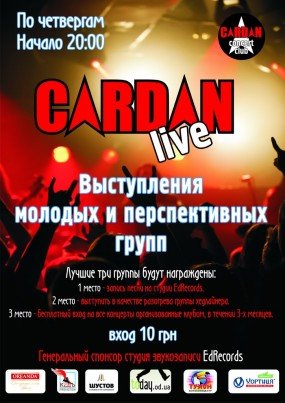 Cardan Live - это проект созданный помогать молодым (или начинающим) музыкантам. Каждый будет услышан! Так как наша цель - развитие молодежной культуы. Приходи и покажи что ты можешь, мы ждем именно тебя!