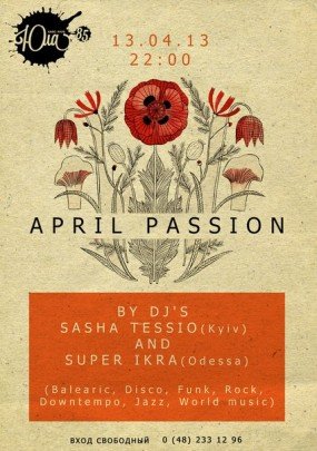 Специально для этой чудесной апрельской ночи приезжает один из самых романтичных диск-жокеев Киева , фанатичный музыкальный digger и коллекционер винила, резидент лучших диско-вечеринок страны LOW, а также интеллигент с большой буквы - Sasha Tessio.