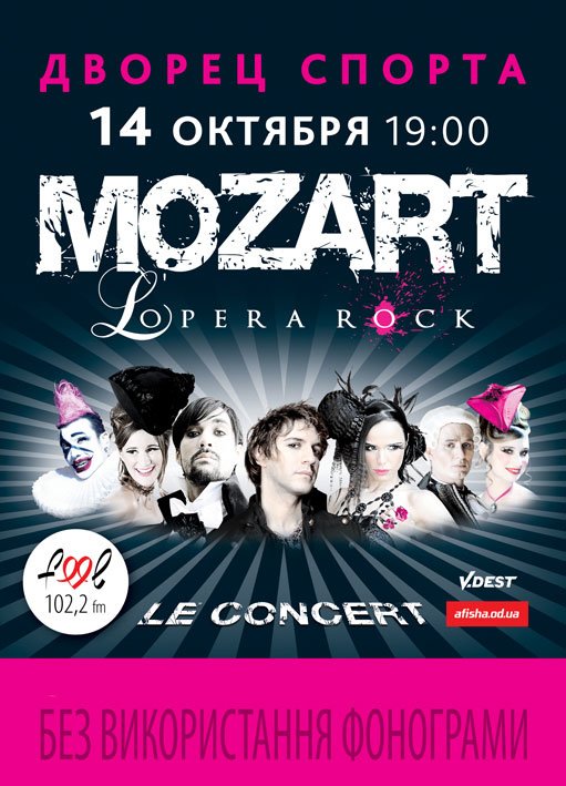 В феврале следующего года встречайте рок-оперу «Моцарт» в Киеве, феерический микс рок-музыки и виртуозных классических композиций, будораживших изысканную Францию, респектабельную Швейцарию и Бельгийское королевство. Золотой состав мюзикла Дова Атья и Альбера Коэна представлен солистами Микеланджело Локонте (он же Вольфганг Амадей Моцарт), Флораном Мотом (Антонио Сальери – соперник Маэстро), Солалем, Маэвой Мелин, Мелиссой Марс, Диан Дассини и еще сотней артистов и музыкантов.