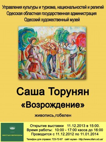Приглашаем Вас на выставку Саши Торуняна "Возрождение" где будут представлены работы по живописи и гобелены.