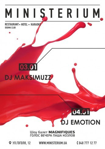 Предлагаем Вам не сбавлять темп новогоднего веселья и проводить пятницу на танцполе Ministerium! Вас ждет ждет бенефис супер диджея Maksimuzz! Наш лучший и самый любимый резидент как всегда порадует всех отменным сетом.