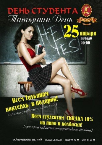 Дорогие наши гости, ресторан-пивоварня "Люстдорф" приглашает отпраздновать "Татьянин День" и "День Студента"!