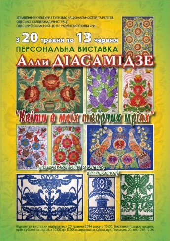 Состоится открытие персональной выставки «Цветы в моих творческих мечтах» Аллы Григорьевны Диасамидзе (г. Ильичевск) , лауреата областной премии им . Р.Палецького 2014 года в номинации «Декоративная роспись» , мастера народного искусства.