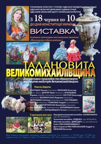 До Дня Конституції України у виставковій залі Одеськогообласного центру української культури відбудеться відкриття виставки образотворчого та декоративно-прикладного мистецтва Великомихайлівського району «ТалановитаВеликомихайлівщина». Вироби народного мистецтва, які виготовляють мешканці району дивують своє красою, неповторністю та майстерністю.