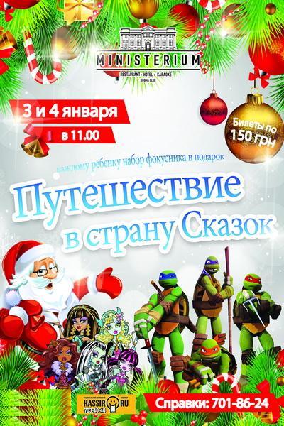 Все мы мечтаем попасть в настоящую сказку.Но, в сказку нельзя отправиться на машине или автобусе, туда не ходят поезда и самолеты, туда можно отправиться только с помощью ее величества принцессы фантазии! Так что бери друзей, хорошее настроение, отвагу и приходи в Министериум на новогоднее представление! В этом году тебя ждет много нового интересного! Подарки от деда мороза , научные чудеса от снегурочки,Вместе с Ниндзя Черепашками,Монстр Хай и Фиксиками вы попадете в настоящую зимнюю сказку, и конечно же подарки,песни, танцы, и много всего всего интересного!