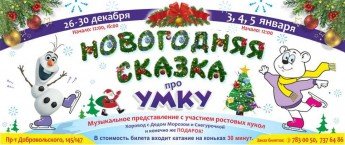 Мы приглашаем ваших малышей на самый волшебный праздник детства – Новогодний утренник на катке Умка. Специальное представление для Ваших детей с катанием на коньках с участием ростовых кукол – медвежонка Умки и Снеговика Олова, и, конечно же, Деда Мороза и Снегурочки.