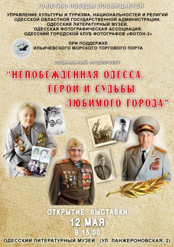 Общественная организация «Одесская фотографическая ассоциация» и Одесский городской клуб фотографов «Фотон-2» представляют социальный фотопроект «Непобежденная Одесса. Герои и судьбы любимого города», посвященный 70-й годовщине Великой Победы и 50-летию присвоения Одессе звания «Город-Герой» и награждения медалью «Золотая звезда» (08.05.1965).