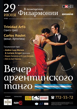 Аргентинское танго — это всегда история, маленькая история, интимная и личная, в чем-то даже банальная ... Но в этой банальности — самый высокий уровень обобщения, когда глубоко личное оказывается общим для всех людей. Аргентинское танго — это тепло, любовь, радость общения и понимания. Артисты из Украины и Аргентины, посвящая свою творческую жизнь танго, приглашают вас окунуться в эту волшебную атмосферу — согреть душу, зажечь сердце и вдохновить тело.