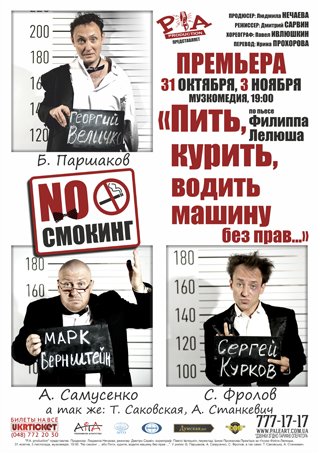 Продюсерское агентство «P.A. production» подготовило для зрителей новый театральный проект по одноимённой пьесе известного французского драматурга и сценариста, Филиппа Лелюша - «Пить, курить, водить машину без прав с превышением скорости»!