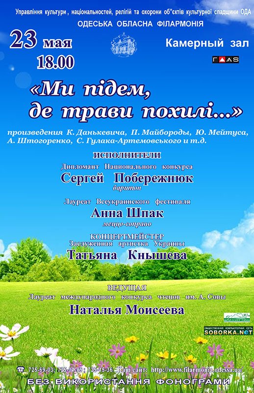 Вечер вокальной музыки. Исполнители – солисты Одесской филармонии.
