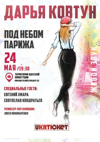 Концертная программа "Под небом Парижа" - это уникальное сочетание потрясающего голоса, виртуозной игры лучших музыкантов, актерского перфоманса, и уличного настроения Парижа, которое ощущается в каждой детали концерта. Мероприятие пройдёт во второй раз. Предыдущая программа прошла в Киеве осенью, с аншлагом. Певица подготовила полуторачасовую программу, во время которой зрители смогут приобщиться к музыкальной культуре Франции, благодаря известным и душевным французским мелодиям. Также гостей ожидает музыкальный сюрприз - украинские песни на французском языке. В мероприятии примут участие звездные гости: украинский композитор, пианист-виртуоз, обладатель Голливудской премии импровизаторов - Евгений Хмара, и первая скрипка Украины, дирижер государственного эстрадно-симфонического оркестра - Святослав Кондратьев.