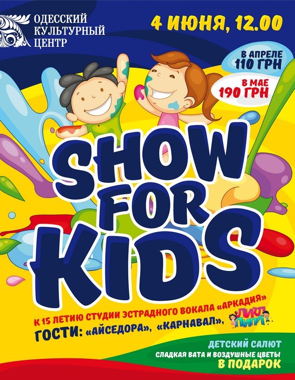 Яркие танцы, веселые песни, добрые аниматоры, анимация на огромном телевизоре, воздушные подарки, детский салют, сладкая вата и многое другое приготовили вам организаторы по случаю праздника на самой современной сцене Одесского культурного центра. Устроители по случаю 15 летия рождения студии эстрадного вокала «Аркадия» приготовят именниный торт со свечами и отличное праздничное настроение.