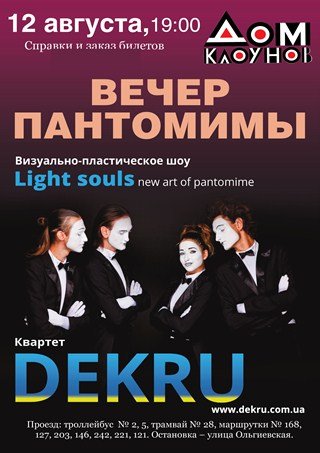 "Light souls" обладает уникальным сочетанием смешного и серьезного. Квартет «DEKRU» - мастера мирового класса, лауреаты I международного фестиваля клоунады и пантомимы КОМЕДИАДА г.Одесса. Их творчество уже поразило Францию, Италию, Голландию, Польшу и др. В спектакле «Light souls» сплелись самые чистые и искренние человеческие эмоции, которые подарят прекрасное настроение, наполнив сердца зрителей добротой и любовью.