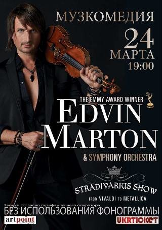 Впервые в Украине! На сцене театра Музкомедии выступит всемирно известный скрипач-виртуоз, непревзойденный шоумен, лауреат премий Emmy, MTV и Eurovision - Эдвин Мартон (Edvin Marton)! Рожденный в Украине, он возвращается на Родину с взрывным концертом! Классика и современность, лирическая скрипка и бурные ритмы рока в невероятном музыкальном шоу «Stradivarius Show».
