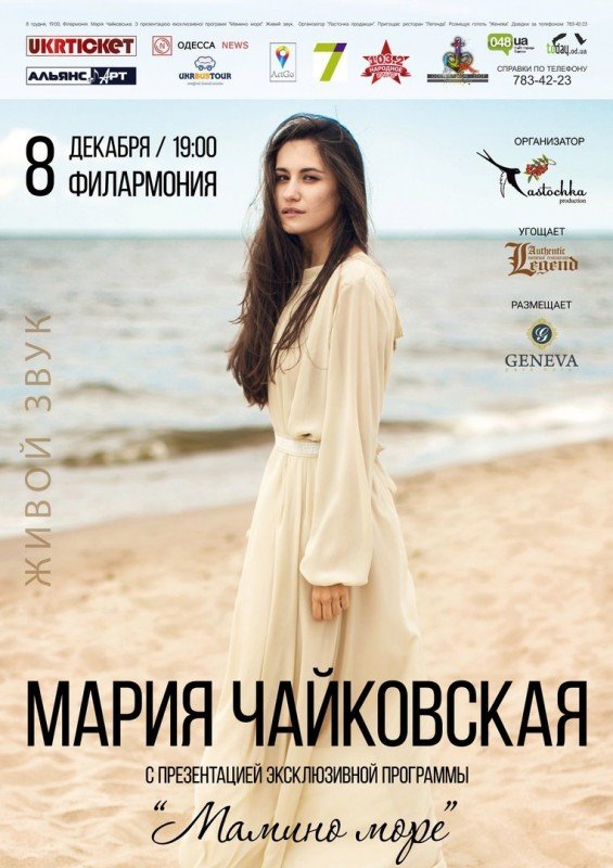 "Мамино море" - новая программа, которую Мария подготовила специально для любимого приморского города. В программе соединились лучшие песни из трех музыкальных альбомов певицы, а также неизданные премьеры, объединенные особым лирическим чувством, присущим только ей.