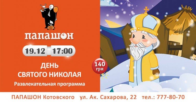 «Папашон» представляет вашему вниманию развлекательную программу с турниром по боулингу: «Сказка от святого Николая». Вас ждут розыгрыши, грандиозное бумажное шоу, дискотека, мини аквагримм – в подарок. А кроме этого, кто же не любит получать подарки? Подарки и сюрпризы любят все, особенно детвора! А когда же готовить получать подарки, если не в День Святого Николая? Сегодня – день настоящих чудес, день доброты, тепла т радости. Так что сегодня берите своих деток на мастер-класс по изготовлению сапожка для подарков в Папашоне на Котовского - чем больше сапожок, тем больше подарков в него поместится. Готовимся!