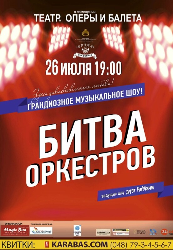 Щелчки тумблеров на пульте звукорежиссера. Клацанье кейсов для инструментов. Дрожание и мигание только-только включившихся софитов. Первые звуки разминающихся скрипок, низкое уханье трубы. Дирижер стучит палочкой об пюпитр, где разместилась увесистая партитура. Взмах. И выстроенный, мелодичный грохот начался. Это "Битва оркестров" и Киев снова принимает масштабное музыкальное сражение. Увидеть шоу живьем вы сможете 26 июля 2017 года в Одессе в Оперном театре. Почему стоит сходить на "Битву Оркестров"? Размах. На большой сцене между собой "выяснять отношения" будут два оркестра. В трех этапах музыканты будут показывать все свои умения и самое главное - быть одной командой. Новизна.
