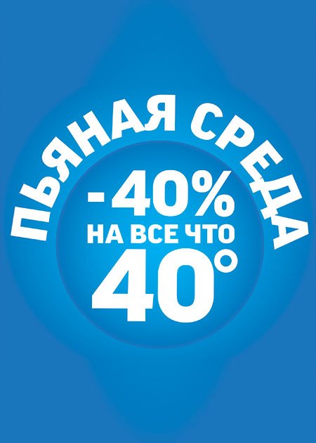 Тематическая вечеринка «Пьяная среда». Для Вас мы приготовили специальную развлекательную программу, ну и конечно же самый приятный сюрприз это скидка в -40% на все что выше 40 градусов!