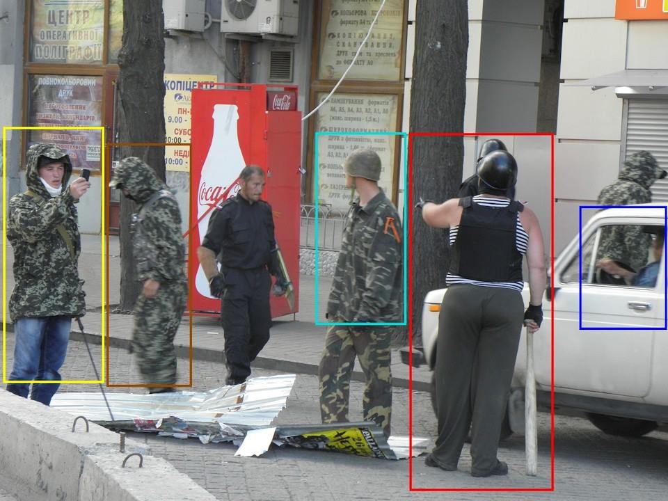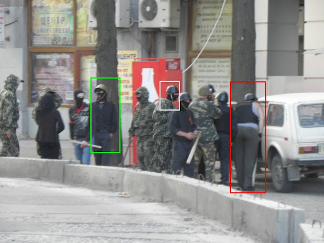 На ряде фотографий изображен автомобиль “Нива” ВАЗ 2121 белого цвета, припаркованный у тыльной стороны Центра болгарской культуры - в зоне, занимаемой во время противостояния “Антимайданом”. Георгиевские ленты и экипировка окружающих автомобиль людей позволяют утверждать это с уверенностью.