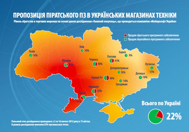 Эти данные были получены в результате очередной волны программы «Тайный покупатель», которую ежеквартально проводит компания «Майкрософт Украина». Интересен тот факт, что Одесса еще не самый «пиратский» регион страны. Например, в Кривом Роге в аналогичных условиях в 49% случаев предложена установка нелицензионного программного обеспечения, а в Николаеве — в 43% случаев.