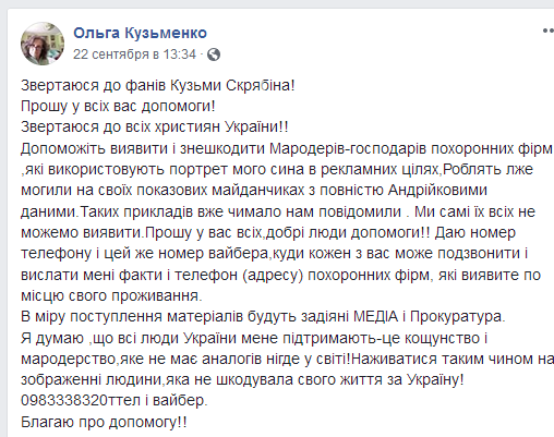 Портрет певца и его данные могильщики используют в рекламных целях. Мать погибшего певца - Ольга Кузьменко - намерена обратиться в прокуратуру.