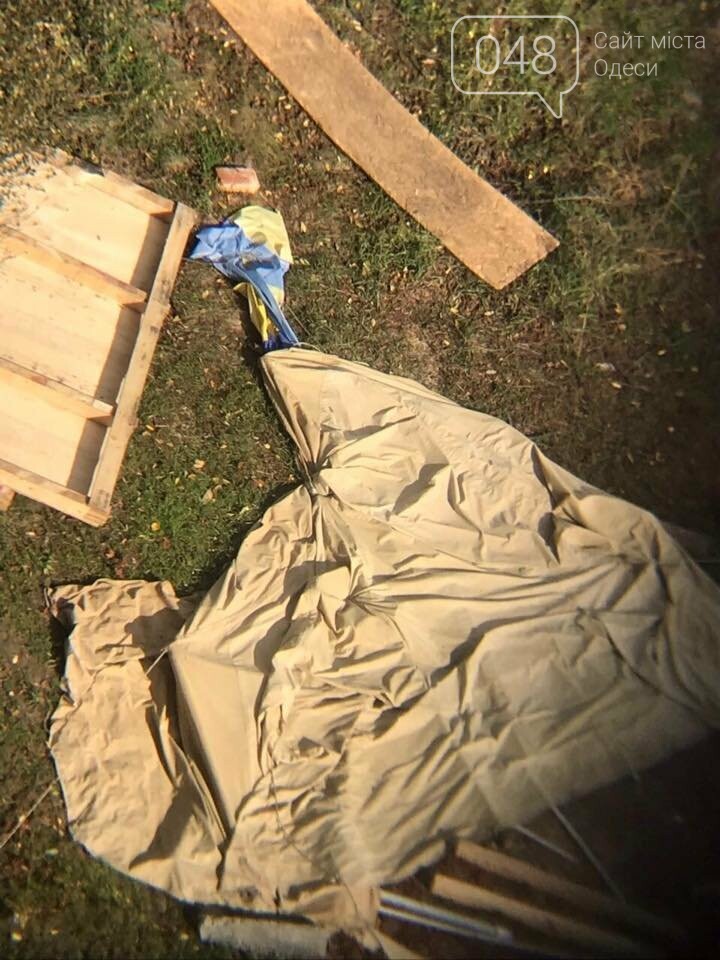 "На Гагаринском плато, 4 завезли титушек, с палатками, которые уже здымилы до заезда тяжелой техники, посмотрите на фото, там в болоте валяется наш украинский флаг, над которым они поиздевались! О чем это говорит, кто эти люди?! Кто так хохочет нам в лицо?!", - написала Мария Мостовчук.