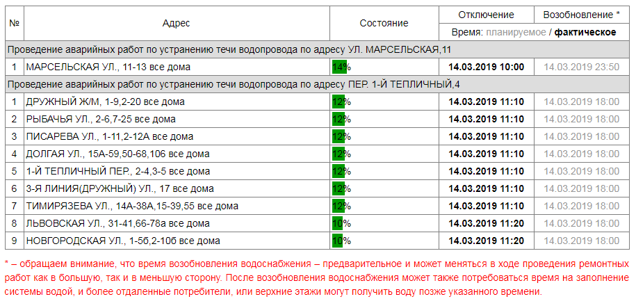 Еще одна авария произошла на водопроводе по адресу переулок 1-й Тепличный, 4. Здесь без воды остались жители жилого массива "Дружный" (1-9,2-20 все дома), а также улиц: Рыбачьей (2-6,7-25 все дома), Писарева (1-11,2-12А все дома), Долгой (15А-59,50-68,106 все дома), 1-й Тепличного переулка (2-4,3-5 все дома), 3-й Линии (Дружный) (17 все дома), Тимирязаева (14А-38А,15-39,55 все дома), Львовской (31-41,66-78а все дома) и Новгородской (1-5б,2-10б все дома).