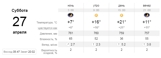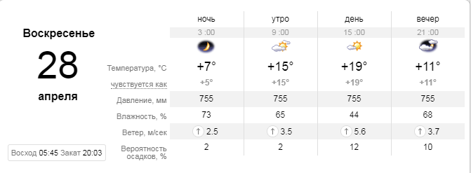 В воскресенье, 28 апреля, немного похолодает. Ясное небо над Одессой будет наблюдаться недолго, почти весь день небо затянут тучи. Несмотря на это, дождя в этот день боятся не стоит. Воздух в этот день прогреется от +15 до +19 градусов.