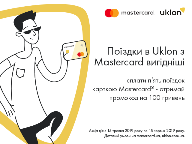 Компании Uklon и Mastercard запустили совместную промо-акцию для популяризации безналичных платежей. По условиям акции с 15 мая до 15 июня, заказывая авто на сайте или в приложении Uklon и оплачивая картой Mastercard 5-ти поездок пользователь получает промокод номиналом в 100 грн на следующую поездку.