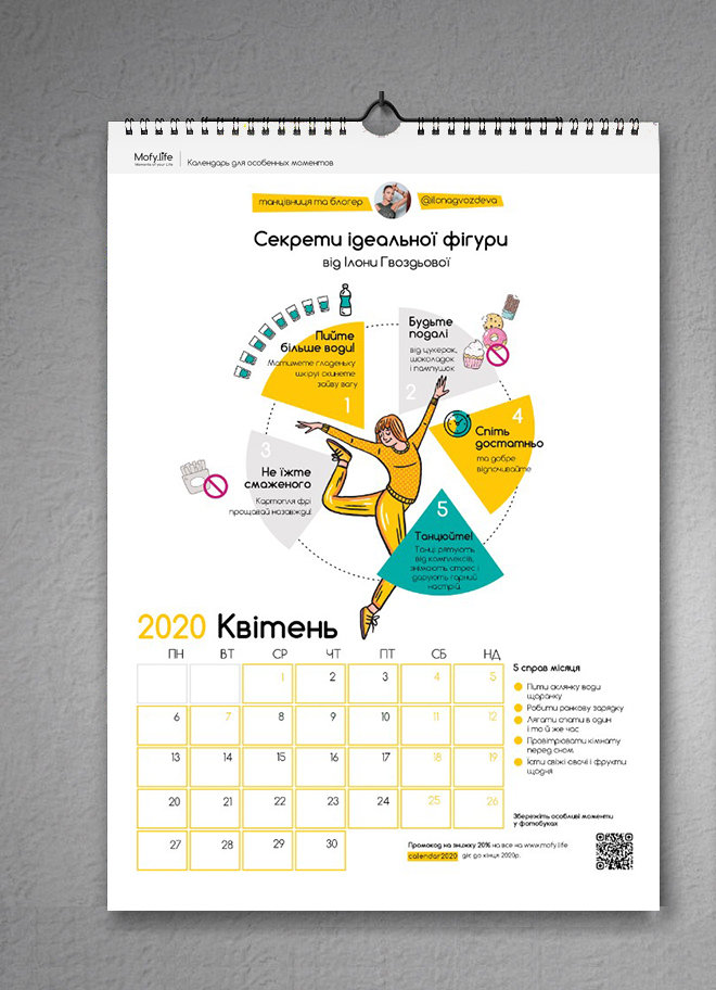 Календарь-планер Mofy.life - это 12 стриничек хорошего настроения, вдохновения и полезных советов. У каждого месяца своя тематика - личный рост, здоровье, путешествия, отношения, экология, праздники и подарки. Следуя советам, шаг за шагом можно изменить свою жизнь к лучшему. И сделать наступающий год по-настоящему особенным.
