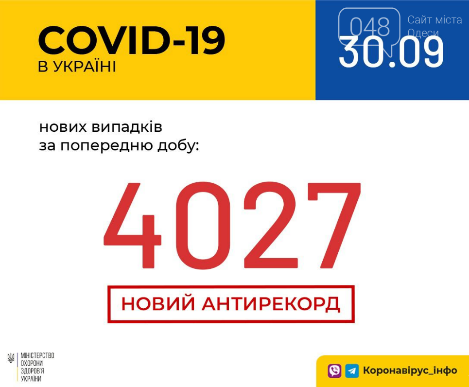 В Украине установлен очередной антирекорд по количеству новых случаев заболеваемости коронавирусом. По состоянию на утро 30 сентября их зарегистрировано 4027. Выздоровели и выписаны из больниц 2110 пациентов. В Центр общественного здоровья поступило 4551 сообщение о подозрении на COVID-19.