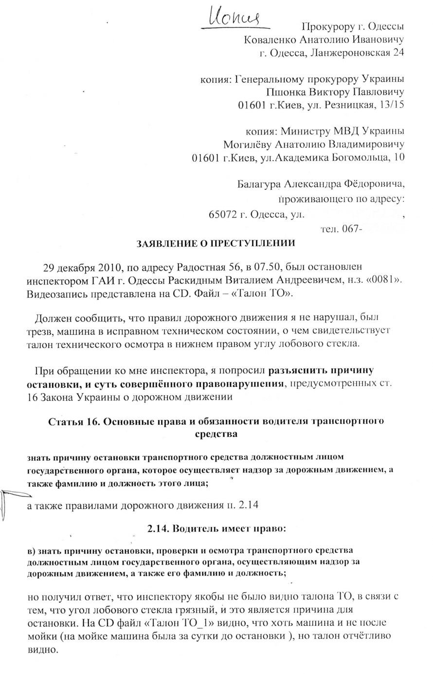 Несколько дней назад Александр получил на руки постановление первой инстанции, которое набрало законную силу. На его основании одессит написал 5 заявлений о преступлении в соответствии со ст. 214 УПК Украины как на инспектора, так и на прокурорских «деятелей»: - сотрудника ДПС Раскидного В.А., помощника прокурора города Ромазовую Т.Н., бывшего заместителя прокурора города Костенко С.К., действующего заместителя прокурора Хорсуненко О.В. и самого прокурора города Фуртата. Последний, по словам одессита, не согласился с решением Конституционного суда Украины, отменил в Апелляционном суде постановление суда первой инстанции, которое уже было в законной силе. Так что продолжение истории не за горами.